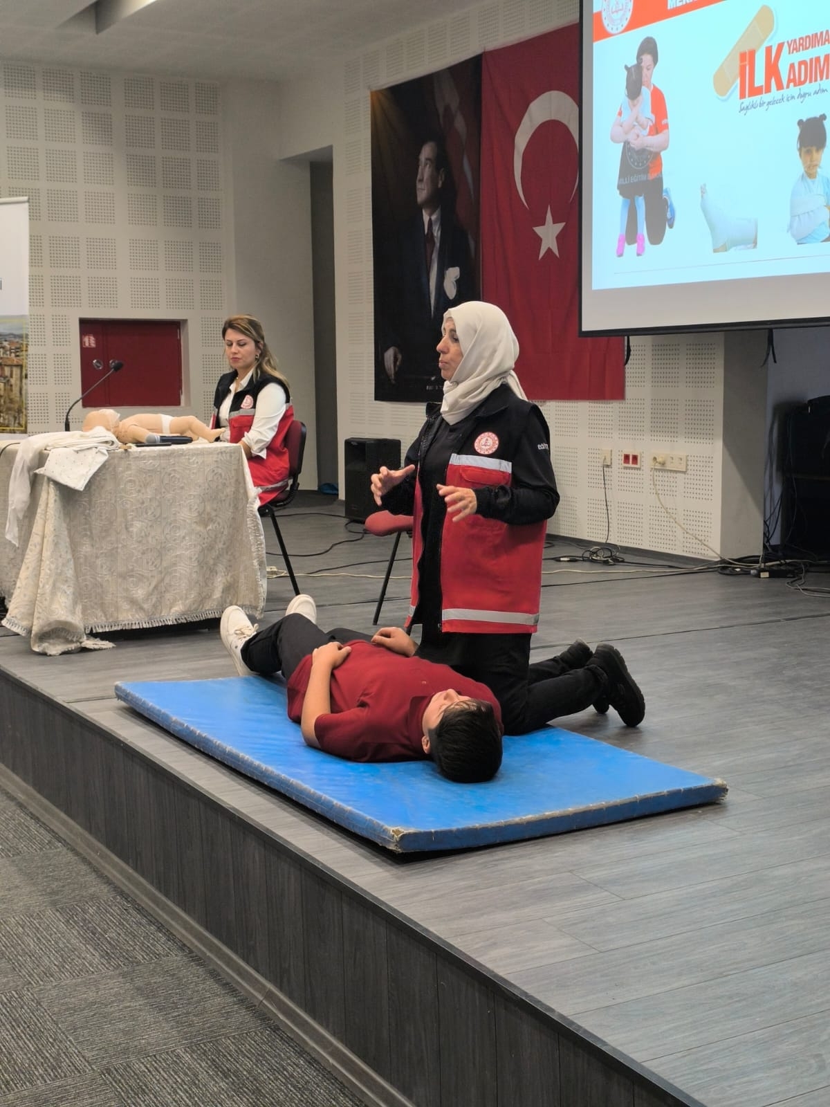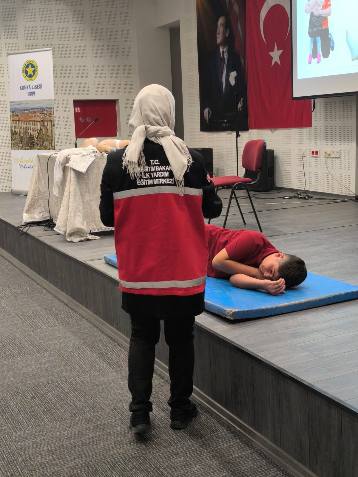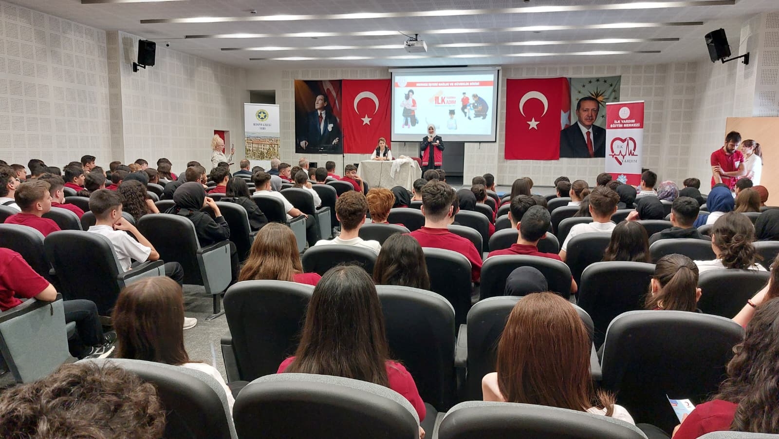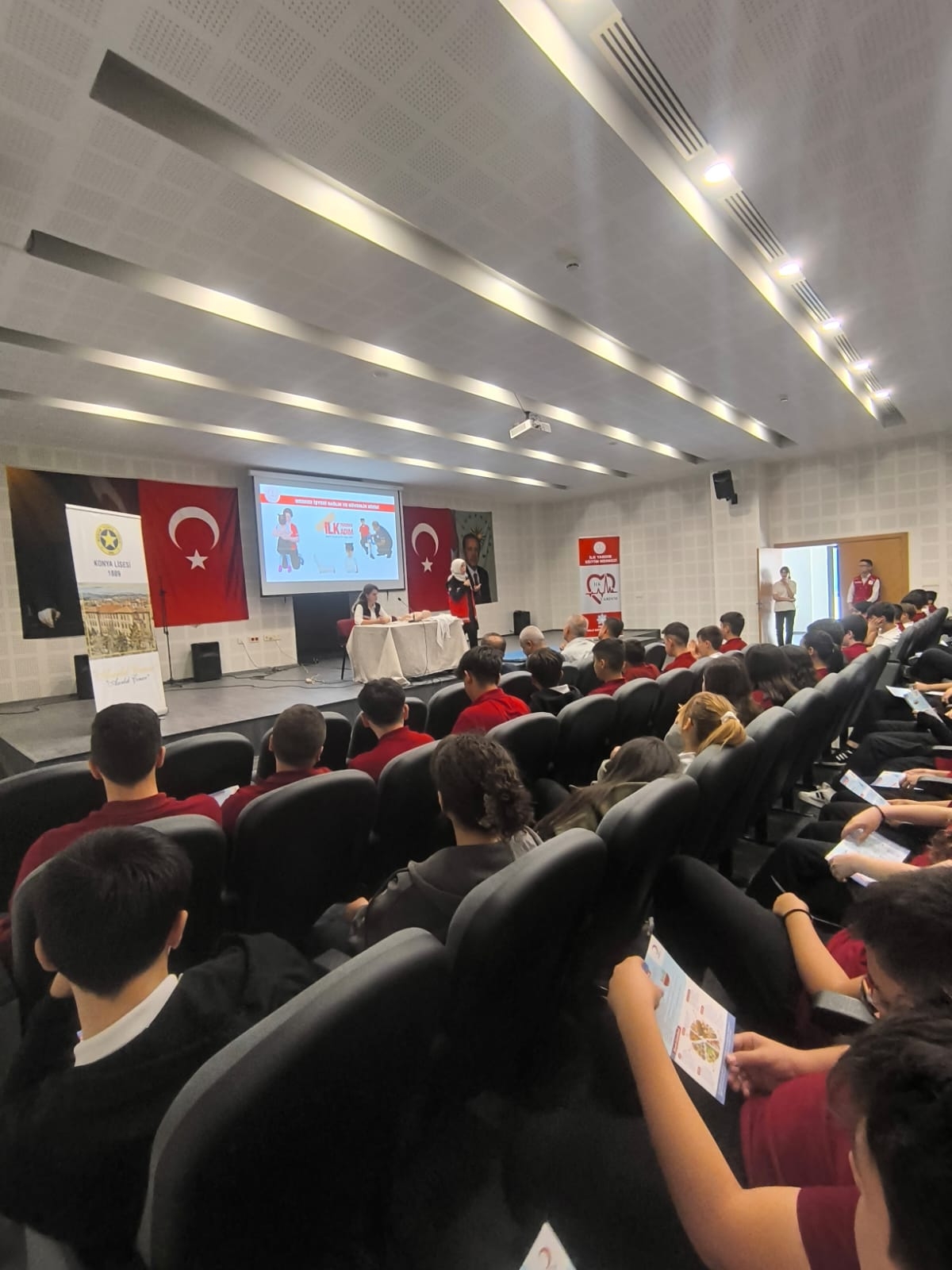Geleceğimizin teminatı çocuklarımızın sağlıklı eğitim ortamlarında yetiştirilmesi, öğrenci ve öğretmenler ile okul paydaşlarında koruyucu, önleyici, acil müdahale gerektiren kazalar ve ani hastalık durumunda, tıbbi yardım gelinceye kadar yapılabilecek ilk yardım uygulamaları hakkında farkındalık ve duyarlılık oluşturulması için Konya Lisesi'nde İl Müdür Yardımcısı Bayram Ali ÇELİK, kurum öğretmenleri ve öğrencilerimizin katılımıyla "Dünya İlk Yardım Günü" kutlanmıştır.